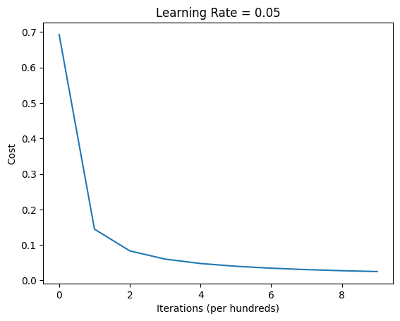 # Train the model!costs = build_and_train_model(X_train, Y_train, X_test, Y_test, num_iterations=1000, learning_rate=0.05)# Plot the learning curveplt.plot(costs)plt.ylabel('Cost')plt.xlabel('Iterations (per hundreds)')plt.title("Learning Rate = 0.05")plt.show()