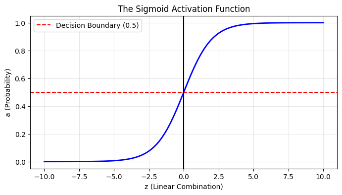 # Generate a range of numbers from -10 to 10z_vals = np.linspace(-10, 10, 100)# Pass them through our sigmoid functiona_vals = sigmoid(z_vals)plt.figure(figsize=(8, 4))plt.plot(z_vals, a_vals, color='blue', linewidth=2)plt.title("The Sigmoid Activation Function")plt.xlabel("z (Linear Combination)")plt.ylabel("a (Probability)")plt.axhline(y=0.5, color='r', linestyle='--', label="Decision Boundary (0.5)")plt.axvline(x=0, color='k', linestyle='-')plt.grid(alpha=0.3)plt.legend()plt.show()