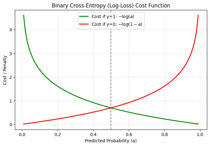 # Probabilities from 0.01 to 0.99 (avoiding 0 and 1 to prevent log(0) errors)a = np.linspace(0.01, 0.99, 100)# Cost when the true label (y) is 1cost_y1 =-np.log(a)# Cost when the true label (y) is 0cost_y0 =-np.log(1- a)plt.figure(figsize=(8, 5))plt.plot(a, cost_y1, label="Cost if y=1: $-\log(a)$", color='green', linewidth=2)plt.plot(a, cost_y0, label="Cost if y=0: $-\log(1-a)$", color='red', linewidth=2)plt.title("Binary Cross-Entropy (Log-Loss) Cost Function")plt.xlabel("Predicted Probability (a)")plt.ylabel("Cost / Penalty")plt.axvline(x=0.5, color='k', linestyle='--', alpha=0.5)plt.grid(alpha=0.3)plt.legend()plt.show()