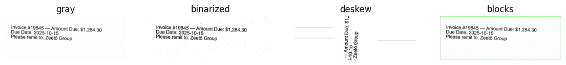 Real documents are messy: skewed, low DPI, scans with lines and stamps, or multi-column layouts. Below is a compact pipeline you can adapt anywhere.