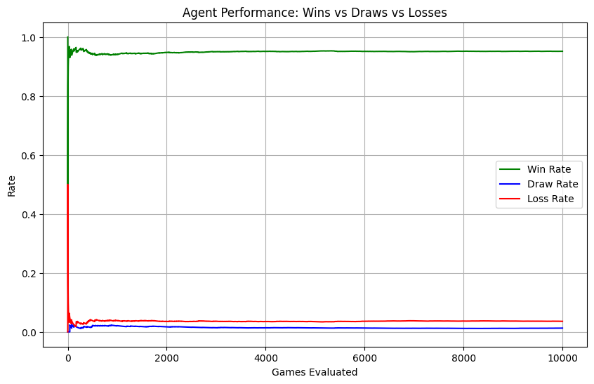 def evaluate_detailed(p1, rounds=500): env = TicTacToe() random_p = Agent("random", exp_rate=1.0) p1.exp_rate =0 results = [] # 1 for win, 0 for draw, -1 for lossfor i inrange(rounds):whilenot env.is_end:# P1 (Trained) positions = env.available_positions() p1_action = p1.choose_action(positions, env.board, 1) env.update_state(p1_action) win = env.winner()if win isnotNone: results.append(win) # 1=Win, 0=Draw, -1=Loss env.reset()break# Random Opponent positions = env.available_positions() p2_action = random_p.choose_action(positions, env.board, -1) env.update_state(p2_action) win = env.winner()if win isnotNone: results.append(win) env.reset()breakreturn results# ... [After Training] ...game_results = evaluate_detailed(p1_agent, 10000)# Process Resultswins = [1if r ==1else0for r in game_results]draws = [1if r ==0else0for r in game_results]losses = [1if r ==-1else0for r in game_results]# Cumulative Ratesgames_played = np.arange(1, len(game_results) +1)win_rate = np.cumsum(wins) / games_playeddraw_rate = np.cumsum(draws) / games_playedloss_rate = np.cumsum(losses) / games_played# Plottingplt.figure(figsize=(10, 6))plt.plot(win_rate, label='Win Rate', color='green')plt.plot(draw_rate, label='Draw Rate', color='blue')plt.plot(loss_rate, label='Loss Rate', color='red')plt.title('Agent Performance: Wins vs Draws vs Losses')plt.xlabel('Games Evaluated')plt.ylabel('Rate')plt.legend()plt.grid(True)plt.show()