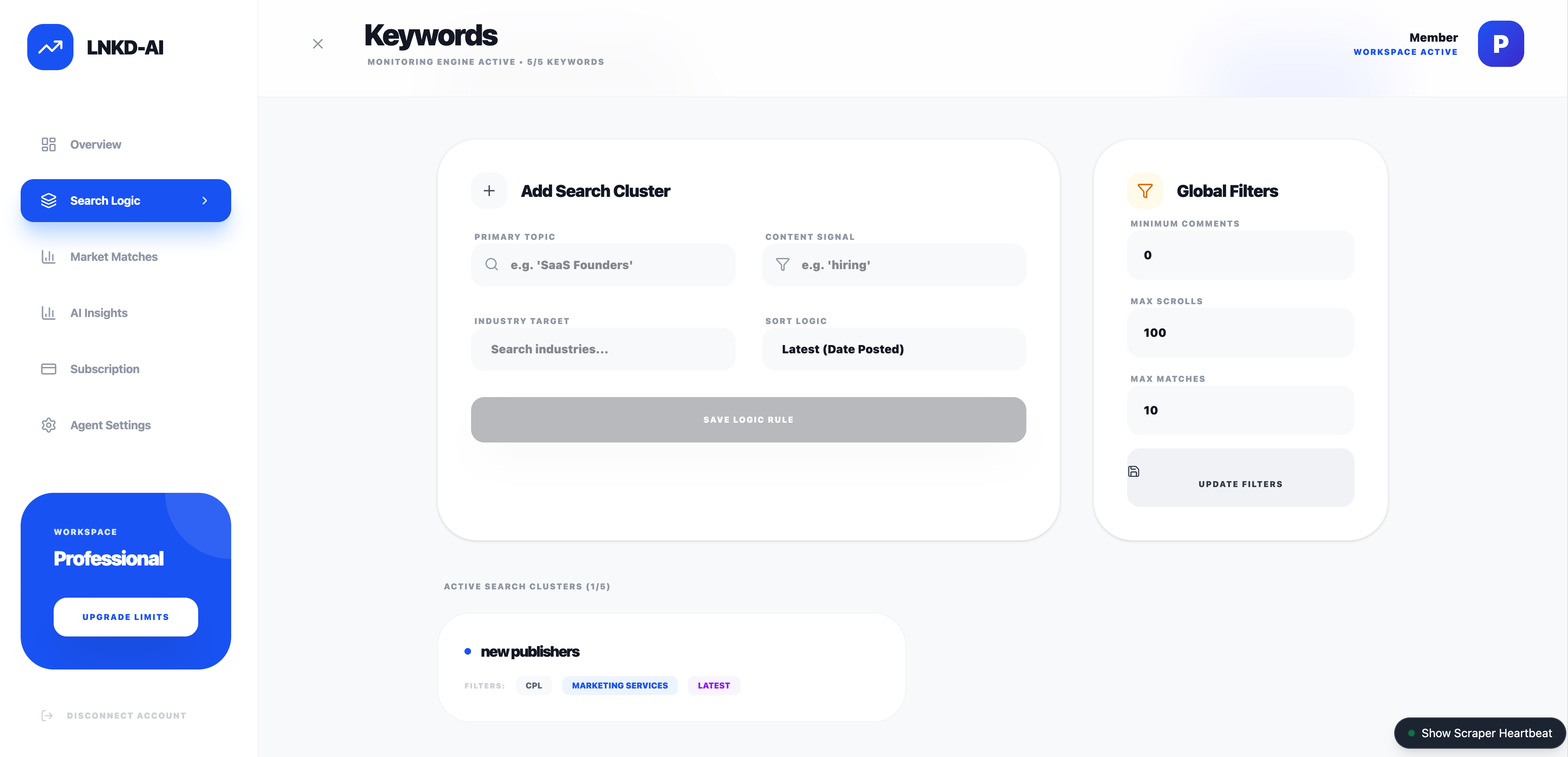 LNKD-AI is designed to automate the “Search & Qualify” loop. Its primary function is to autonomously navigate LinkedIn search results, scan post content for specific keywords or topics, and capture relevant data for lead generation.