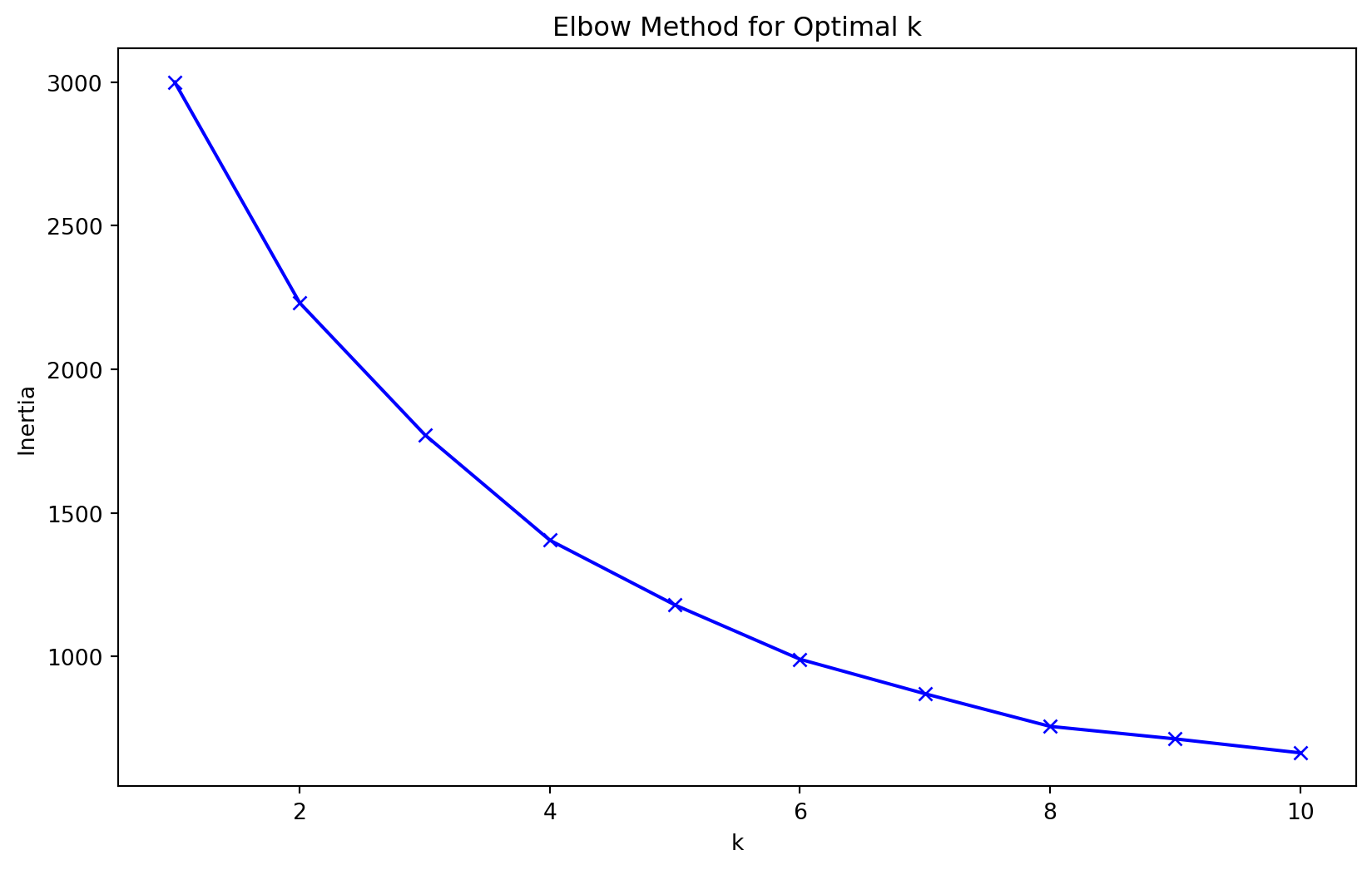 # Elbow method to find the optimal number of clustersinertias = []k_range =range(1, 11)for k in k_range: kmeans = KMeans(n_clusters=k, random_state=42) kmeans.fit(scaled_features) inertias.append(kmeans.inertia_)# Plot the elbow curveplt.figure(figsize=(10, 6))plt.plot(k_range, inertias, 'bx-')plt.xlabel('k')plt.ylabel('Inertia')plt.title('Elbow Method for Optimal k')plt.show()# Choose the optimal number of clusters (let's say it's 4 for this example)optimal_k =4# Apply K-means with the optimal number of clusterskmeans = KMeans(n_clusters=optimal_k, random_state=42)cluster_labels = kmeans.fit_predict(scaled_features)# Add cluster labels to the original DataFramedf['Cluster'] = cluster_labelsprint(df.head())