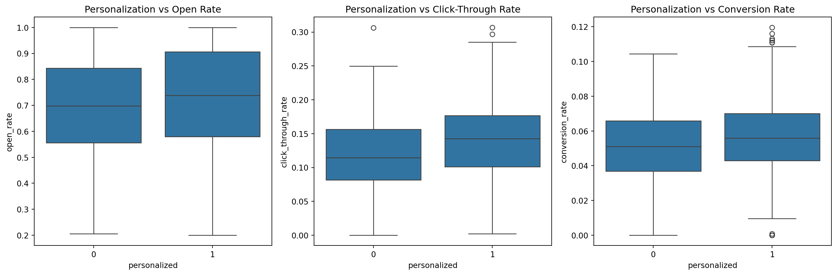 - Personalization has a positive impact on all three target variables: open rate, click-through rate, and conversion rate.
