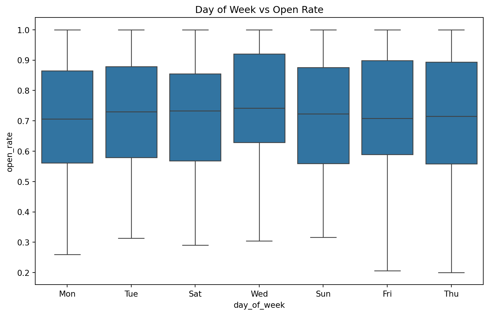 'open_rate'] = 0.2 + 0.1 * np.random.randn(n_samples) + 0.01 * df['subject_length'] - 0.02 * (df['day_of_week'] == 'Sat') - 0.02 * (df['day_of_week'] == 'Sun') + 0.05 * df['personalized']